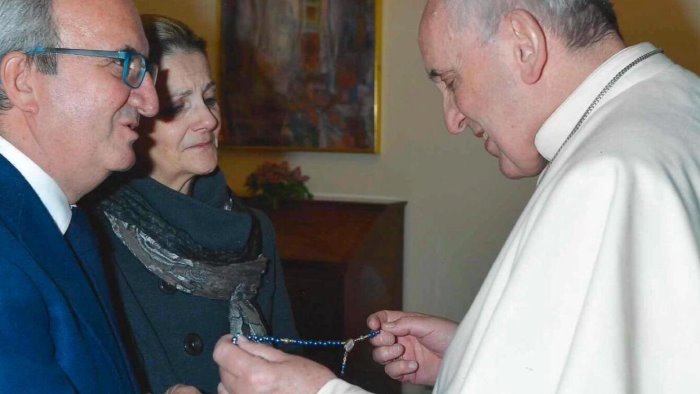 E qui, ora, apro il mio libro dei ricordi. Ne conservo uno che brilla più di tutti nei quattro incontri avuti con il Pontefice: era un freddo mercoledì di febbraio del 2014. Con mia moglie Mena, reduce da un delicato intervento cardiaco, ebbi l’onore di partecipare alla Messa delle sei del mattino nella cappella privata di Santa Marta. L’atmosfera era surreale: un gruppo ristretto di cardinali, poche suore, una decina di fedeli stranieri, il silenzio. Poi, lui: apparve accanto a noi, in pantofole. Salutò con un sorriso e iniziò la celebrazione. Ogni parola aveva il peso della verità, ogni gesto il sapore della santità. Dopo la Messa, si avvicinò. Un invito alla preghiera per la pace, poi quei sette minuti, intensi, profondi, privati. Ci parlammo. Gli donammo un Rosario fatto dai detenuti di Poggioreale, ricevendone uno del Vaticano. E infine, congedandoci, ci lasciò con poche parole che porterò nel cuore finché vivrò: “‘A Maronn v’accumpagn’”, era quello il saluto del cardinale Crescenzio Sepe.