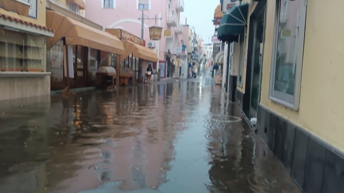 E' bastato un forte temporale estivo per far ripiombare Ischia e i suoi abitanti nella paura. Allagamenti e disagi in tutti i comuni dell’isola, ma soprattutto in centro nella zona Porto e quindi a pochi metri di distanza dal mare, l’acqua ha invaso il Corso principale. Il forte acquazzone ha allagato tutte le strade: l’acqua a via Roma ha raggiunto il livello del marciapiedi e il tombino al centro dell’incrocio tra Via delle Terme e via de Rivaz è saltato causa la furia dell’acqua piovana venuta giù.