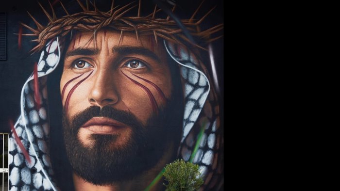 L’immagine raffigura un Gesù dallo sguardo intenso e sofferente, lontano dall’iconografia tradizionale salvifica. Sul capo, la corona di spine si intreccia con una kefiah, il copricapo simbolo della causa e del popolo palestinese. Nell’iride sinistra, invece, è nascosto un dettaglio che amplifica il messaggio dell’opera: Guernica, il celebre dipinto di Pablo Picasso che denunciò gli orrori dei bombardamenti sulla popolazione civile durante la guerra civile spagnola.