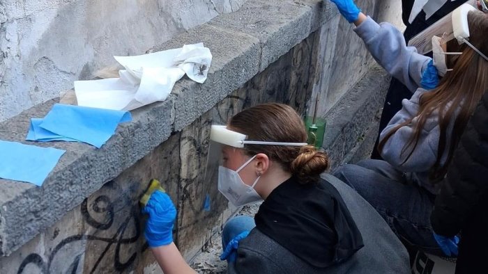 - Rimozione delle scritte vandaliche: l'impiego di prodotti ecologici biodegradabili permetterà di eliminare il degrado senza alterare la pietra lavica e il travertino originali.