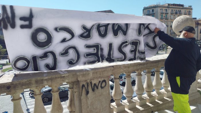 E’ stato rimosso questa mattina dagli operatori della Napoli Servizi uno striscione, su una balaustra dell’Albergo dei Poveri, recante la scritta “Io festeggio San Marco”.
