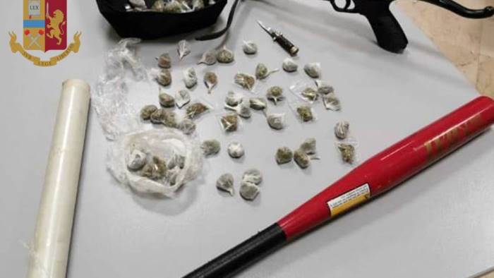 Dopo aver individuato l’appartamento da cui era stato gettato, i poliziotti sono entrati ed hanno scoperto due giovani ai quali hanno sequestrato un coltello, una mazza da baseball, una balestra e materiale per il confezionamento della droga; inoltre, nel borsello di cui i due si erano disfatti, sono stati rinvenuti numerosi involucri di marijuana per un peso complessivo di circa 43 grammi.