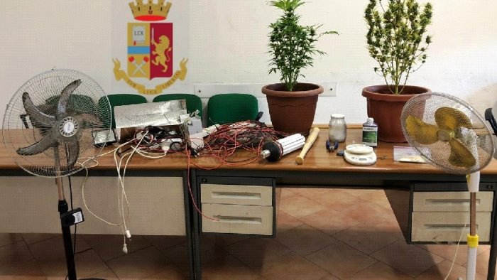 I poliziotti, una volta entrati, hanno scoperto una piccola serra per la coltivazione di piante di marijuana completa di lampada alogena per accelerarne la crescita, due bilancini, due ventilatori, diverso materiale per la coltivazione e per il confezionamento della droga e una mazza da baseball. Il locale è stato sottoposto a sequestro.