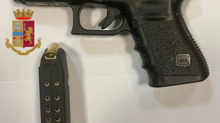 I Falchi della Squadra Mobile, durante un servizio di contrasto allo spaccio di sostanze stupefacenti, hanno controllato in viale della Resistenza un uomo a bordo di un'auto in cui hanno rinvenuto, occultata sotto l'imbottitura dei sedili posteriori, una pistola marca Glock cal.19 con matricola abrasa e completa di caricatore con 3 cartucce, 5 involucri contenenti 1,5 grammi circa di cocaina e 321 euro. Un 25enne napoletano con precedenti, è stato arrestato per porto abusivo di arma da sparo con matricola abrasa, ricettazione, detenzione ai fini di spaccio di sostanza stupefacente mentre l'auto è stata sottoposta a sequestro