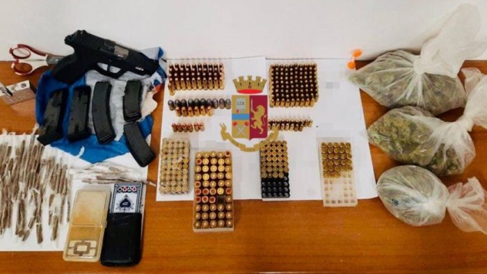Gli agenti del commissariato San Giovanni-Barra, hanno rinvenuto, nascosti in un terraneo del rione Colombo, una pistola semiautomatica di fabbricazione ceca calibro 9 con matricola abrasa, 5 caricatori privi di cartucce, 331 cartucce di vario calibro, tre buste contenenti 150 grammi circa di marijuana, 33 involucri di hashish del peso di 45 grammi e 2 bilancini di precisione. Indagini in corso.