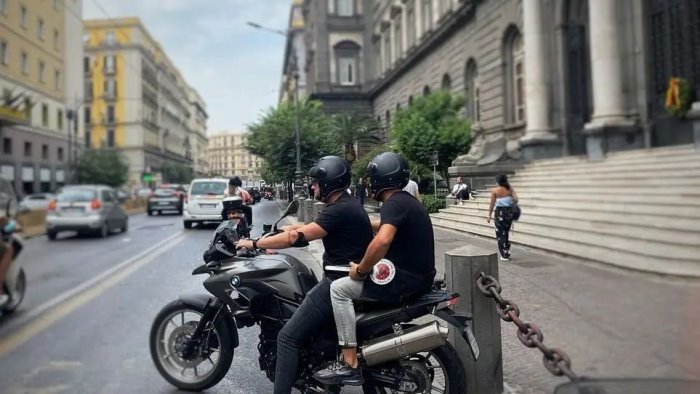 Due 18enni napoletani sono stati arrestati per furto con strappo e sanzionati per mancato utilizzo del casco protettivo; inoltre, il conducente è stato sanzionato per guida senza patente poiché mai conseguita e il motociclo è stato sequestrato poiché già sottoposto a fermo amministrativo.