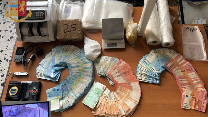 I poliziotti, una volta entrati, hanno rinvenuto un involucro con 173 grammi circa di cocaina, una busta contenente 43.990 euro, un bilancino di precisione, un coltello, una macchina conta soldi e diverso materiale per il confezionamento della droga mentre, occultato in un armadio, un portafogli con all’interno uno stemma raffigurante la “Squadra Volante” della Polizia di Stato; infine, gli operatori hanno rinvenuto una microcamera posta all’ingresso dello stabile.