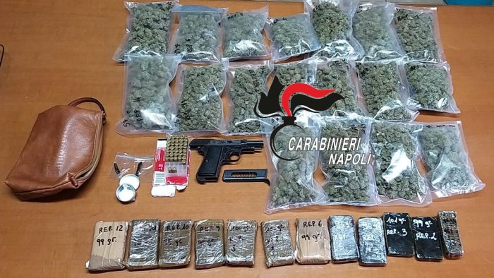 I carabinieri della tenenza di Sant’Antimo hanno arrestato per detenzione di droga a fini di spaccio e detenzione di arma clandestina e munizionamento un 55enne del posto già noto. Durante una perquisizione nella sua abitazione e nel suo box auto, i militari hanno rinvenuto 1 chilo di marijuana distribuito in 18 buste di plastica, 12 panetti di hashish da 100 grammi, quasi 3 grammi di cocaina e una pistola Beretta cal. 7,65mm.