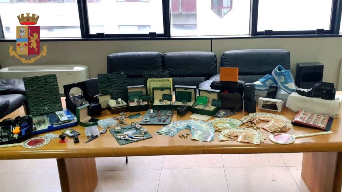 Inoltre, gli operatori hanno effettuato un controllo in via Pietro Germi presso l’abitazione dell’uomo dove hanno trovato 148 cartucce calibro 9 a salve, 10 cartucce da fucile calibro 12, 17 orologi di cui 16 contraffatti e uno autentico, una garanzia in pergamena di un noto marchio di orologeria, 5 buste di carta per il confezionamento riportanti lo stesso marchio, 3 cinturini in acciaio e 4 scatole di note “griffe” di alta orologeria, un kit contenenti un trapano professionale per incisioni, ricambi, mini punte da lavoro, utensili per riparazioni di orologi, un telefono cellulare ancora confezionato, 6426 euro, tre pochette e due paia di scarpe contraffatte di note case di moda.
