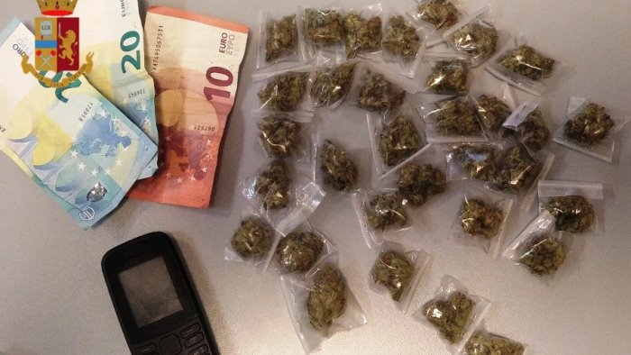 I poliziotti li hanno raggiunti e bloccati trovando lo spacciatore in possesso di 4 bustine contenenti 4,4 grammi circa di marijuana, 50 euro e un cellulare, mentre i due acquirenti sono stati trovati in possesso di una bustina con 1,1 grammo della stessa sostanza; inoltre, sotto la pianta sono state rinvenute altre 29 bustine con circa 32 grammi di marijuana.