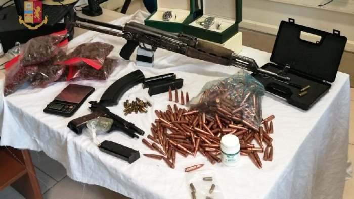 Gli agenti della squadra mobile hanno effettuato un controllo presso un'abitazione a Casalnuovo di Napoli. Qui hanno trovato il proprietario ed un altro uomo, con 30 cartucce di vario calibro, due caricatori, uno dei quali con 13 cartucce, una bustina con 3,7 grammi di marijuana, un bilancino, materiale per il confezionamento della droga e, in un vaso, 6 buste con 412 grammi circa della stessa sostanza. Inoltre, sotto un materasso, hanno rinvenuto una pistola beretta calibro 9x21 con matricola abrasa caricata con 13 cartucce e una in canna, mentre, sul balcone, hanno rinvenuto un fucile mitragliatore d’assalto Ak47 Kalashnikov caricato con 30 cartucce cal. 7.62x39 da guerra nonché 420 cartucce dello stesso calibro. Infine, in un’altra camera da letto, hanno trovato due orologi di un noto marchio.