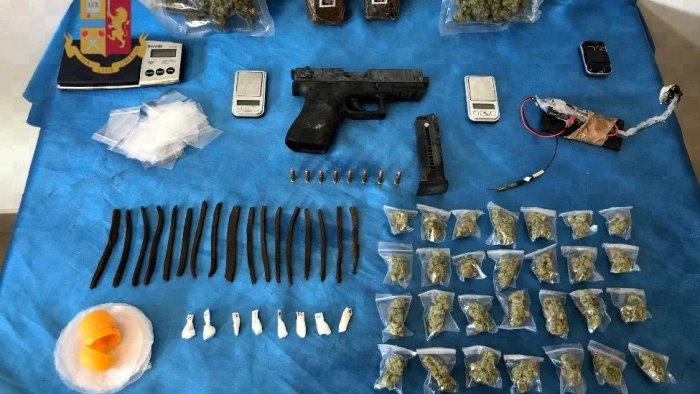 I poliziotti lo hanno raggiunto e bloccato rinvenendo nella busta 15 stecche e 5 pezzetti di hashish del peso di circa 28 grammi, 8 involucri contenenti 2,3 grammi circa di cocaina e 10 bustine con 12,2 grammi circa di marijuana; inoltre, a terra dietro il pilastro dell’edificio, hanno trovato 3 bilancini di precisione e diverso materiale per il confezionamento della droga.