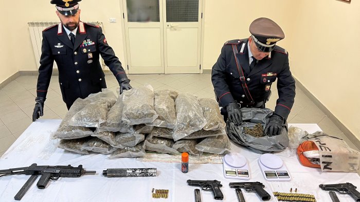 Un mitragliatore con silenziatore, tre pistole calibro 9, una con matricola punzonata e una risultata provento di un furto commesso nel 2017 in un comando di polizia municipale in provincia di Torino e 65 di proiettili dello stesso calibro. E ancora 18 buste al cui interno erano racchiusi circa 18 chili di marijuana già essiccata e pronta per lo smercio. Non mancano i bilancini e materiale vario per la preparazione delle dosi.