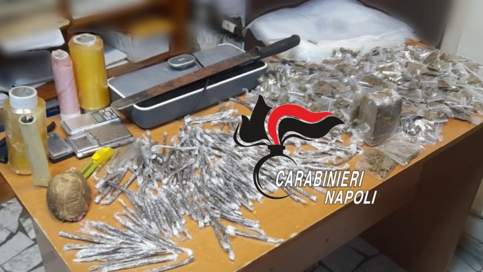 Durante un servizio notturno di controllo del territorio ad Arpino di Casoria i carabinieri della locale stazione hanno perquisito il sottoscala del complesso di edilizia popolare di via Pascoli. Rinvenuta un'importante quantità di sostanza stupefacente già confezionata e pronta per lo spaccio che era stata nascosta in una cantinola. Venivano pertanto sequestrate 241 dosi di hashish e tre panetti della medesima sostanza per un totale di 750 grammi, 454 dosi di marijuana per un peso complessivo di 400 grammi oltre a diverso materiale per il taglio e il confezionamento della droga.