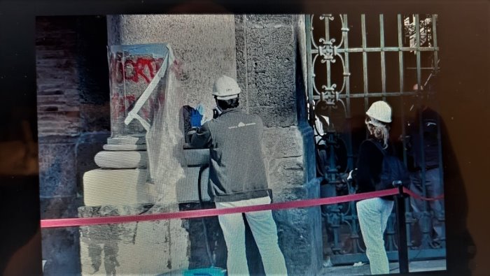 Da qualche ora davanti all'ingresso di Palazzo Reale sono comparse delle transenne: tecnici specializzati sono al lavoro per ripulire le colonne e la facciata monumentale che sorge in piazza del Plebiscito, nel cuore di Napoli, dalle scritte e dai graffiti che sono comparsi un paio di giorni fa, dopo che per le strade del centro del capoluogo campano è passato il corteo di protesta contro il decreto anti-rave.