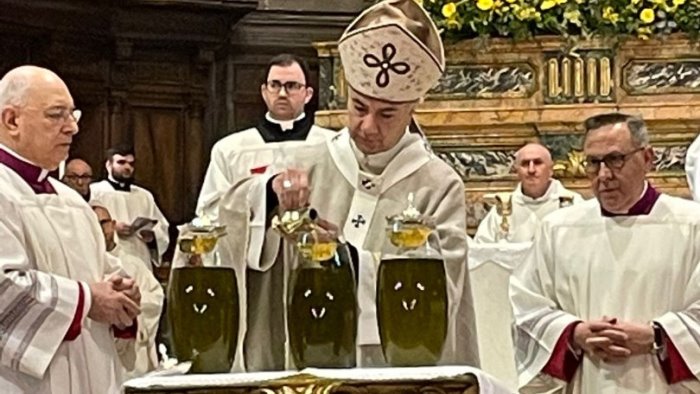 Il questore Alessandro Giuliano ha consegnato all'arcivescovo di Napoli don Mimmo Battaglia l'olio che sarà utilizzato per il crisma durante i battesimi, le cresime e l'ordinazione di sacerdoti e vescovi.