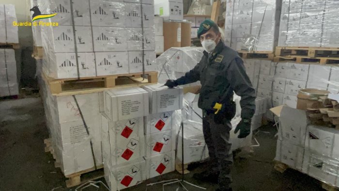 I finanzieri del Gruppo di Torre Annunziata hanno sequestrato anche 35mila litri di prodotto liquido, 17mila etichette di note case produttrici, nonchè un'area di 1.500 metri quadrati.