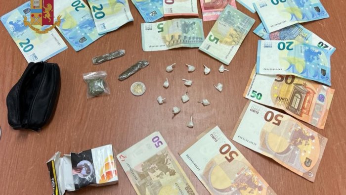 I poliziotti hanno bloccato i due spacciatori trovandoli in possesso di 392 euro mentre la donna è riuscita ad allontanarsi facendo perdere le sue tracce, inoltre, nello stipite della porta di uno scantinato e su una cornice metallica sotto i porticati dell’edificio, hanno rinvenuto due stecche di hashish del peso di circa 3 grammi, una bustina contenente circa un grammo di marijuana e 12 involucri contenenti circa 4 grammi di cocaina.