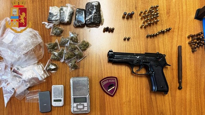 I poliziotti hanno recuperato lo zaino in cui hanno rinvenuto una pistola replica cal.9 con 4 proiettili e canna modificata, 56 cartucce di vario calibro, un’arma cilindrica mono-colpo a molla, 12 bustine contenenti circa 16 grammi di marijuana e 4 panetti di hashish del peso di circa 230 grammi.