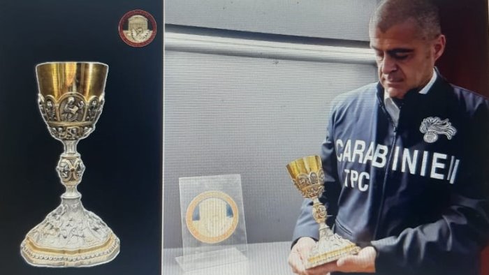 Domani 28 giugno 2023, alle 17:00, presso la sede della Chiesa Santa Maria della Natività del quartiere Secondigliano di Napoli, in occasione dell’ 81° anniversario del sacerdozio di Cosimo Maria Luciano, fondatore della Parrocchia di Santa Maria della Natività e dell’Orfanotrofio Nazareth di Secondigliano, sarà restituito al parroco pro-tempore Don Alberto Russo, dal Comandante del Nucleo Tutela del Patrimonio Culturale (TPC) di Napoli, capitano Massimiliano Croce, un prezioso calice in argento dell’800 illecitamente sottratto alla Chiesa anni addietro.