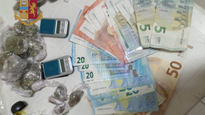I poliziotti lo hanno raggiunto e bloccato trovandolo in possesso di 120 euro e di una bustina contenente marijuana; inoltre, hanno effettuato un controllo presso la sua abitazione dove hanno rinvenuto altre 9 bustine contenenti circa 61 grammi di marijuana, 18 involucri contenenti circa 6 grammi di cocaina, 4 pezzi di hashish del peso di circa 19 grammi, 330 euro e due bilancini di precisione.