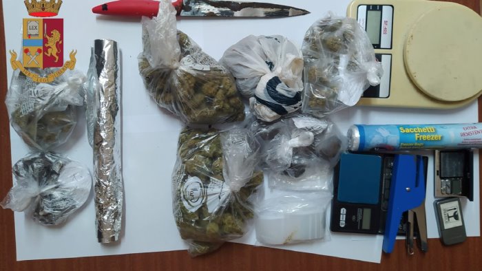 Gli operatori hanno, altresì, controllato l’autovettura dove, nascosti nel bagagliaio, hanno trovato altri 41 involucri di hashish del peso di circa 105 grammi, 25 bustine e 3 buste contenenti circa 210 grammi di marijuana, 4 bilancini di precisione, un coltello della lunghezza di circa 30 centimetri e diverso materiale per il confezionamento della droga.