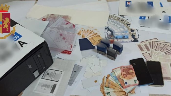 Essendovi fondato motivo di ritenere che potessero esservi ulteriori elementi in ordine ai fatti per quali si stava procedendo, i poliziotti hanno esteso l’attività di controllo all’interno del locale commerciale ed in effetti l’intuito investigativo ha trovato positivo riscontro poiché hanno rinvenuto 3 carte d’identità cartacee valide per l’espatrio intestate ad altrettante persone, di cui due senza effigi, 18 carte d’identità cartacee in bianco, 60 fototessere ritraenti vari soggetti, una serie di materiale utile per la stampa e la fabbricazione di documenti e di targhe di veicoli, 26 biglietti in bianco per eventi di spettacolo, rivetti di varie misure e 2 pinzatrici per apporre le fotografie sui singoli documenti, altre attrezzature specifiche e 600 euro.
