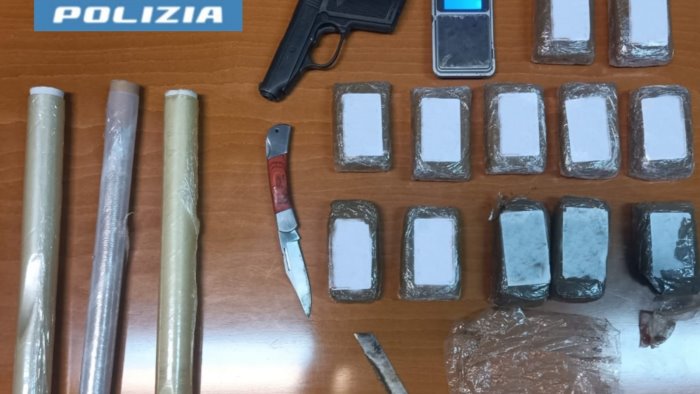 Gli agenti del commissariato di Ischia, hanno controllato un’abitazione in via provinciale Lacco Fango a Lacco Ameno dove hanno rinvenuto, nella camera da letto, 12 panetti di hashish del peso complessivo di circa 1 kg e 200 grammi, un bilancino di precisione, un coltello a serramanico, un taglierino ancora intriso della stessa sostanza, diverso materiale per il confezionamento della droga e una pistola a salve calibro 8 priva di tappo rosso.