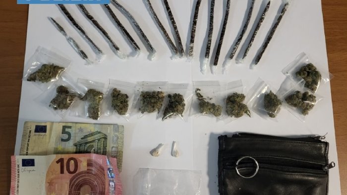 A quel punto, i poliziotti, insospettiti, hanno raggiunto e bloccato l’uomo trovandolo in possesso di due involucri di eroina del peso di circa 1 grammo, 13 stecche di hashish del peso di circa 20 grammi, 11 involucri contenenti circa 12 grammi di marijuana e di 15 euro.