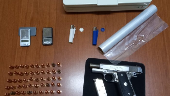 Gli agenti della squadra mobile hanno effettuato un controllo in via Carnaro presso l’abitazione di due donne dove hanno rinvenuto, nel ripostiglio, ben occultati in una borsa, una pistola modello Colt calibro 45 con matricola abrasa con relativo munizionamento, 54 cartucce cal. 45, altre 11 munizioni di vario calibro, 2 bilancini di precisione e diverso materiale per il confezionamento della droga.
