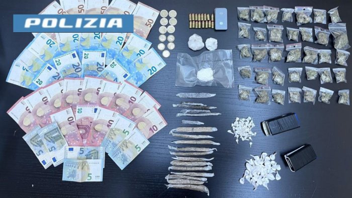 Gli operatori sono prontamente intervenuti per interrompere l’iter criminoso bloccando l’indagato che è stato trovato in possesso di 707 euro, evidente provento dell’attività delittuosa mentre, nel vano elettrico, hanno rinvenuto 98 involucri di cocaina per un peso complessivo di circa 70 grammi, 35 bustine contenenti circa 58 grammi di marijuana, 18 stecche di hashish del peso di circa 62,5 grammi, un bilancino di precisione e 16 munizioni cal. 380 auto.