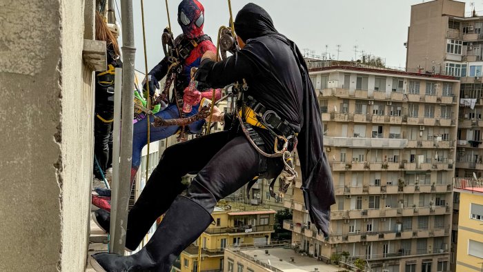 I supereroi, calandosi dal tetto dell'edificio, hanno fatto irruzione nei reparti, sorprendendo e incantando i piccoli pazienti.
