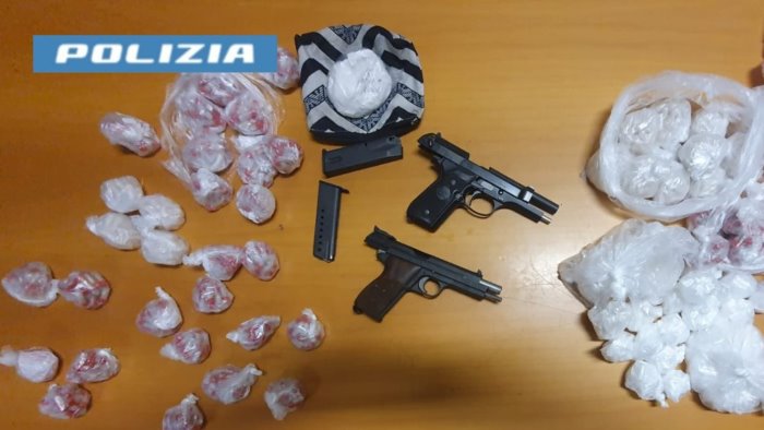 L’immediata attività info-investigativa esperita dagli operatori ha consentito di individuare, poco distante, il luogo dove era stato parcheggiato il motociclo in questione; pertanto, gli agenti hanno controllato il mezzo rinvenendo nel vano sottosella una pistola 9x19, una pistola 9x21, entrambe provento di furto, due buste contenenti 725 cilindretti di oppiacei del peso complessivo di circa 631 grammi ed un fazzoletto di carta contenente scaglie di cocaina del peso di circa 56 grammi.