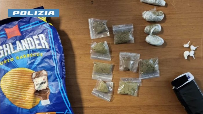 Pertanto, gli operatori sono immediatamente intervenuti bloccandolo e, dopo aver recuperato il sacchetto di patatine e l’astuccio metallico, hanno rinvenuto, al loro interno, 4 involucri di cocaina, 8 bustine e 4 pezzi di hashish per un peso complessivo di circa 32 grammi.