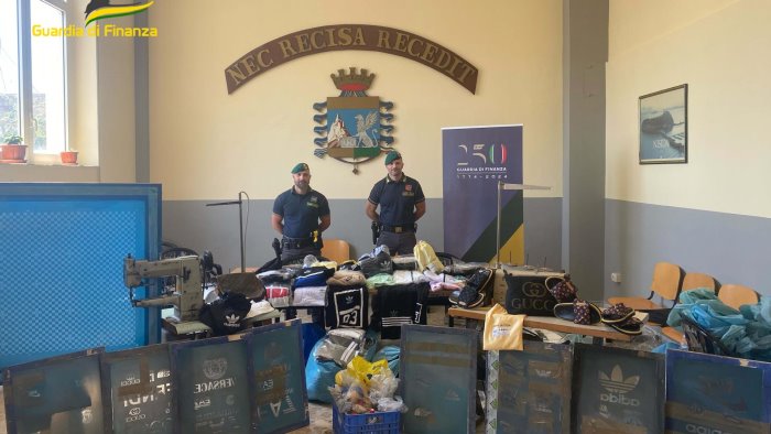 Individuate e sequestrate 70 attrezzature tra macchine da cucire, termo pistole, telai, vernici e spatole, nonché etichette, materiale per il packaging e 8 rotoli da 250 metri di pelle di pregevole qualità, pronta per essere lavorata.