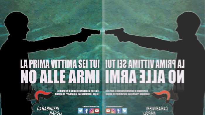 In un poster realizzato dai carabinieri del comando provinciale di Napoli una sagoma di un giovane impugna una pistola e la punta simbolicamente contro uno specchio, contro l’immagine riflessa di sé stesso.