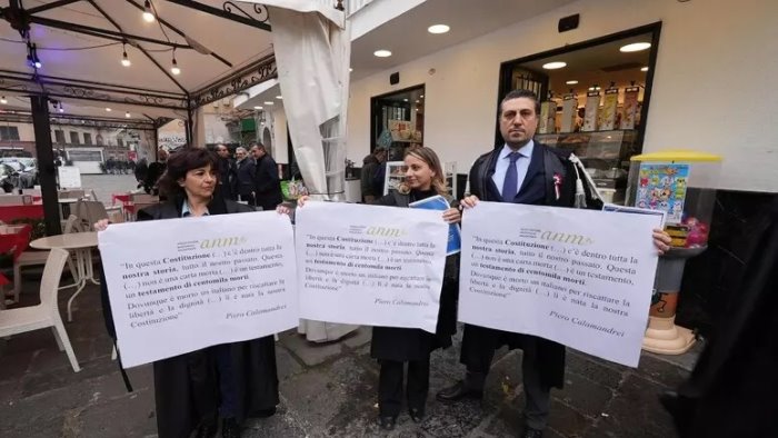 Come deliberato dal Comitato Direttivo dell'Anm in segno di protesta contro la riforma della separazione delle carriere, i magistrati presenti all'inaugurazione dell'anno giudiziario del distretto di Corte d'Appello di Napoli hanno abbandonato il Salone dei Busti di Castel Capuano dopo che ha preso la parola il ministro della Giustizia Carlo Nordio. I magistrati indossano la toga e una coccarda tricolore, tra le mani un pieghevole con i principi fondamentali della Costituzione.