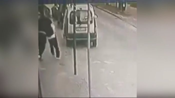 Un uomo trascina il ragazzo e lo spinge nel furgoncino bianco, nonostante i tentativi di resistere al sequestro.