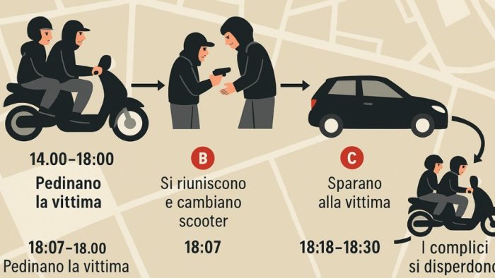 Subito dopo l’esplosione del colpo, lo scooter con i killer fugge a tutta velocità verso via Stella e poi via Fonseca, dirigendosi a nord.