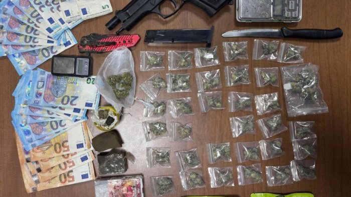 In particolare, i Nibbio dell’ufficio prevenzione generale e soccorso pubblico, nel transitare in via Foria all’angolo con via Duomo, hanno controllato i quattro a bordo di un’autovettura rinvenendo, ben occultata al di sotto del tappetino passeggero posteriore lato guida e nella immediata disponibilità del 21enne, una pistola replica modello 92 priva di tappo rosso; ancora, i poliziotti hanno esteso il controllo agli altri occupanti dell’autovettura trovando il conducente, identificato poi per il 19enne, in possesso di 3 involucri di hashish del peso complessivo di 74 grammi circa, un involucro di marijuana del peso di 3 grammi circa, un coltello da cucina con lama intrisa di sostanza stupefacente e 280 euro, suddivisi in banconote di diverso taglio.