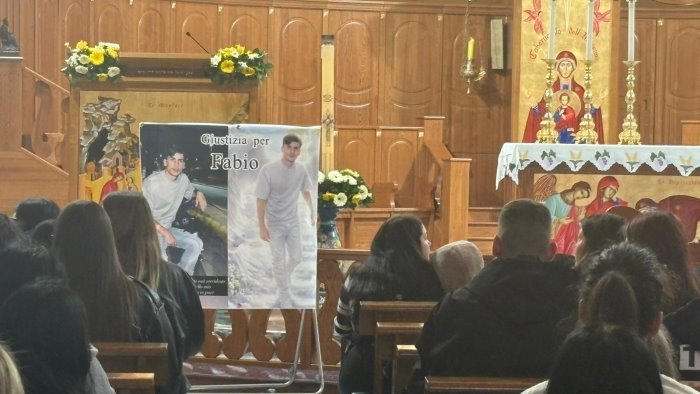 In chiesa la funzione religiosa officiata da don Raffaele: presenti familiari, amici e residenti del quartiere. Assente, invece, la madre che ha avuto un malore non ha potuto presenziare. "Giustizia per Fabio", uno degli striscioni affissi nel sagrato.