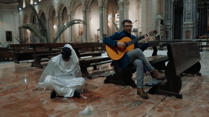 In tal modo, Pulcinella e l’Ave Maria si trovano nel punto dove i secoli si sovrappongono, dove il sacro antico e la fede moderna coincidono. La chiesa diventa una scenografia cosmica, teatro del dialogo tra la miseria dell’uomo e la grandezza divina. In chiave simbolica, il video suggerisce che anche la maschera può diventare volto, che dietro l’ironia dell’esistenza si nasconde un’invocazione autentica».