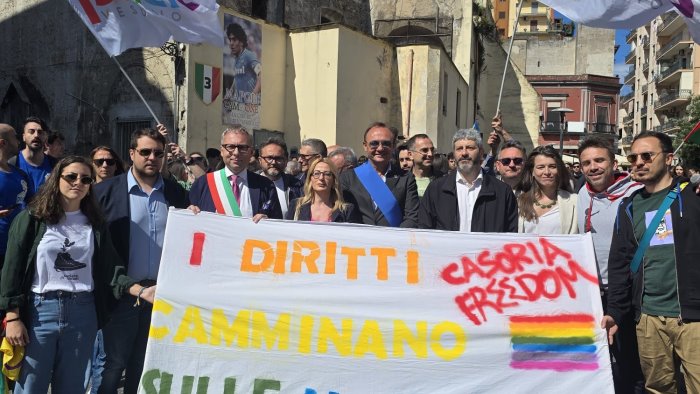 Presente anche il vicesindaco metropolitano Giuseppe Cirillo, che ha espresso apprezzamento per la partecipazione delle scuole: “Oggi Casoria ha dato una lezione di civiltà e coraggio e Città Metropolitana ha esposto le bandiere arcobaleno, in attesa del 23 maggio quando al Maschio Angioino vivremo un’altra grande giornata per i diritti”.