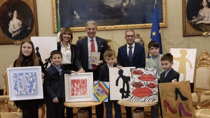 Una delegazione composta dai piccoli Ginevra Miele, Gennaro Franzese, Giancarlo Franzese, Cosimo Corrado Casilli, Giulio Casilli, con il presidente dell’associazione Alessandra Bosone, la musicista e cantante Fiorella Boccucci e il giornalista Nello Fontanella, è stata ospite del vice presidente della Camera dei Deputati Sergio Costa al quale hanno presentato il loro lavoro ispirato all’obiettivo 10 dell’Agenda 2030 “Ridurre le disuguaglianze“.