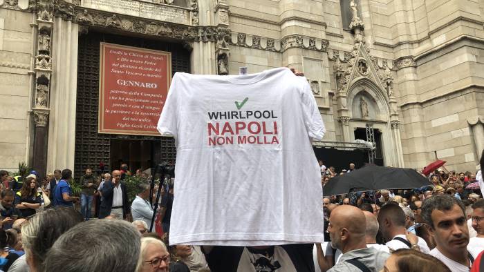 Il leader del movimento delle Sardine ha indossato la maglietta bianca con la scritta "Whirlpool Napoli non molla" simbolo della lotta donatagli dagli operai che hanno annunciato la loro presenza al flash mob anti-Salvini organizzato dalle Sardine alle 19:30 in piazza Dante.