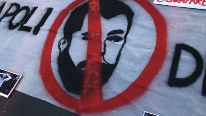 A terra i manifestanti hanno messo uno striscione l' immagine di Salvini coperta da un segnale di divieto e la scritta "Napoli non dimentica" con fotomontaggi che raffigurano il leader leghista come il protagonista del film cult American History X.