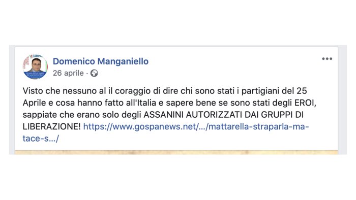 Con questa cinguettio su Twitter il portavoce nazionale di Sinistra Italiana Nicola Fratoianni, ha commentato le affermazioni con le quali un candidato della lista dei repubblicani in appoggio a De Luca per le regionali aveva definito i partigiani “assassini autorizzati”.