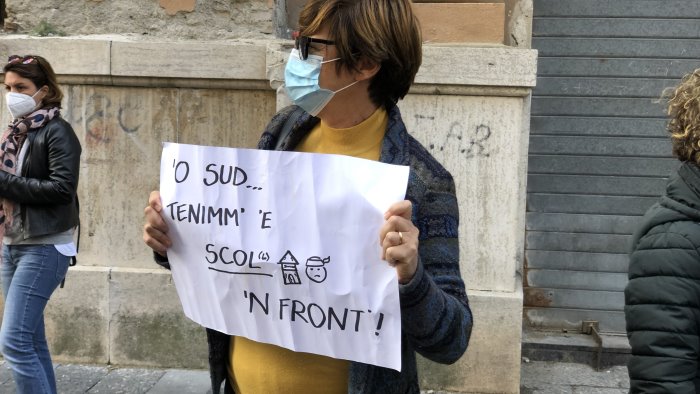 C’è tutto il mondo della scuola chiusa da Vincenzo De Luca, arrivano gli autisti degli scuolabus e con i loro pulmini gialli girano attorno al palazzo suonando i clacson tra gli applausi dei manifestanti.