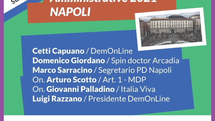 Nuova iniziativa dei Dialoghi a Distanza organizzati da DemOnLine. Lunedì 7 dicembre a partire dalle ore 21.00, online sulla pagina Facebook di DemOnLine ( https://www.facebook.com/demonline.campania) l’incontro dal titolo: “Amministrative 2021: Napoli“. Oltre i promotori dell’iniziativa, Luigi Razzano e Cetti Capuano, partecipano Marco Sarracino, Segretario Metropolitano del PD di Napoli, On. Arturo Scotto MDP - Art.1, On. Giovanni Palladino Italia Viva. Nel corso della discussione verranno presentati, a cura di Domenico Giordano di Arcadia Communication, i sentiment ed i mood dei probabili candidati alle amministrative napoletane 2021, così come sono riportati da sondaggi apparsi sulla stampa.