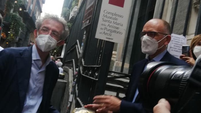 Un tour elettorale con tappa scaramantica alla chiesa di Santa Maria delle Anime del Purgatorio ad Arco, dove Manfredi e Letta hanno accarezzato una «capuzzella» sul Decumano. Sulla sfida delle amministrative il segretario Dem parla del patto Pd – Cinque Stelle: «Sarà un test non c’è dubbio, verificheremo qui principalmente il progetto comune con i 5 stelle. Sono a Napoli fiducioso del futuro della città e del Mezzogiorno, era tanto tempo che non si trovava una dinamica così positiva come quella che si è costruita attorno a Gaetano Manfredi. Il nostro partito ha sofferto tanto nel Mezzogiorno che ha perso tante opportunità. Mi permetto di dire che queste per Napoli sono le piu importanti elezioni della storia Repubblicana perché le risorse europee che arriveranno con il Pnrr per scelte strategiche sono un treno che forse non si ripresenterà più in questi termini. I prossimi anni saranno molto importanti per questa città”